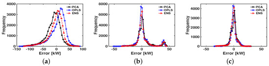 Figure 4a–c boxplots the (error) residuals for the forecasted output in the HUF dataset for the three proposed methods. It can be observed that the PCA method tended to be residual-centered, except after March, when there was a trend of negative residuals dominating, whereas the OPLS method tended to have predominantly positive residuals between November and February. The use of the convex ensemble method yielded a “more centered” set of residuals. In all cases, two kinds of dynamics were revealed: one with lower variance (from October to May), and another with higher variance (from June to September), which was clearly consistent with the yearly seasonality. Figure 4d–f shows the Bland–Altman plots for the three methods. A Blant–Alman plot is a scatter-type representation in which the horizontal axis represents the measured load and the vertical axis represents its corresponding residual. For our dataset, this information showed that heteroscedasticity was indeed present, that is, the variance was not equally distributed along the load. For instance, lower loads consistently had a lower variance, whereas larger loads had an increased variance (and they were biased to negative residuals in all the models). It can be noted that extreme load peaks reduced the variance with respect to the intermediate values, which indicates that the models were more accurate when predicting the peak values.