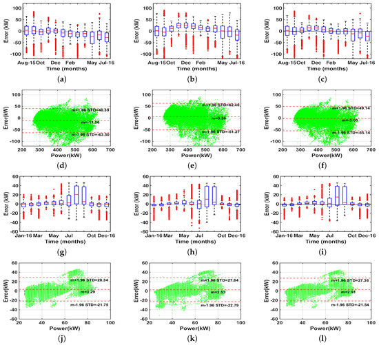In Figure 4g–i, residuals are shown for the CEA dataset. Similarly to the HUF dataset, there was a noticeable difference in the variance from June to September, compared to that of the months between October and May. On the other hand, the atypical residuals above the red dotted line were systematically present in the CEA data, while in the HUF case, such a presence was sporadic. This suggests that the model was biased, which was clearly confirmed by the Bland–Altman plots shown in Figure 4j–l. Heteroscedasticity was not so present, but instead, strongly biased residuals were observed, with a systematic trend of low (high) load amplitudes to be associated with negative (positive) residuals. The presence of this kind of bias in Bland–Altman plots often indicates that the model does not adequately capture the forecast dynamics, and, in this case, further analysis of the data and of the eigenvectors could provide useful insights on the model expression capabilities.