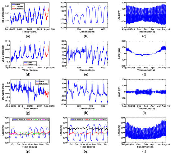 PCA Eigenvector Analysis for HUF. Figure 5 plots the time trajectories for the first three eigenvectors identified after applying PCA to the HUF dataset. Figure 5a shows the projection of the first component on the training data set, showing its annual linear trend by the yellow line superimposed on the load time series. The observed behavior confirms that the component was informative for prediction purposes and that the linear trend had to be accounted for. In red, we have depicted the one-year-ahead forecasted AR component, which followed nicely the pattern of the previous years (blue line). Figure 5b shows the first eigenvector, which clearly accounted for the weekly rhythm with a smooth representation, indicating that this component corresponded to an “average week”. We note that the load component was different on Saturdays and Sundays (second and third peaks) compared with the other days. Figure 5c shows that this pattern represented a smooth trend associated with the two previously identified periods with different residual dynamics but with a slow transition from one to the other as an envelope. Figure 5d,g shows the projections of the second and third components, as well as their AR predicted values, whereas Figure 5e,g represents their associated eigenvectors, which became peaked waveforms, indicating that they were acting as detail markers of the specific form of the average pattern given by the first component. We note that Figure 5f,i shows that their contribution was similarly linked to the two periods with different seasonal dynamics, but the second component showed a smooth behavior, whereas the third component was closer to an on–off switch behavior. To gain further insights, we chose two weeks from our dataset (one from summer and another from winter) and analyzed how strongly each of the different principal components was present in them. As seen in Figure 5p,q, they allowed us to better visualize and understand which component was contributing to an example week in the summer and to another example week in the winter.