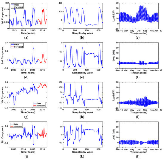 Principal component analysis (PCA) load prediction for Centro de Especialidades El Arroyo (CEA). For the first, second, third, and fourth components, panels show the projection of the coefficients over the year (a,d,g,j), the eigenvector corresponding to that component (b,e,h,k), and the yearly reconstructed partial load with that component (c,f,i,l).