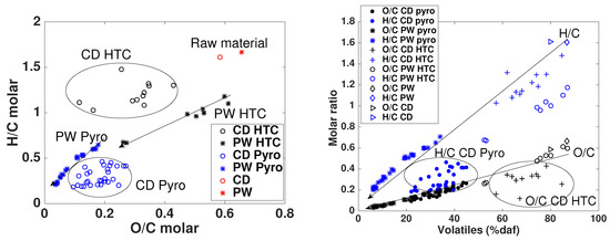 - Regarding primary characterization, biochars O/C molar ratio is linearly correlated to volatiles content, independently of the pyrolysis conditions and feedstock. However, H/C molar ratios of CD biochars are generally lower than those of PW biochars, which may be attributed to the higher inorganic matter content of CD, leading to different pyrolysis reaction pathways and enhancing aromatization. PW hydrochars H/C molar ratio and CD hydrochars O/C molar ratio are also outliers with respect to the linear behavior. This shows that elemental and proximate analysis are not enough to determine the chemical properties of biochars [19], due to the influence of feedstock properties on reaction pathways.