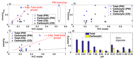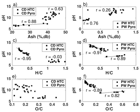 - The pH depends on both conversion process parameters and feedstock, having in general higher pH biochars and hydrochars produced from CD, with much higher inorganic content, including carbonates. In both PW and CD biochars pH correlates strongly with H/C molar ratio. PW biochars and PW hydrochars present also correlation with the O/C ratio. Only CD hydrochars show good correlation (r = 0.88) with the ash content. This shows that the H/C molar ratio may be a better indicator of surface chemistry than O/C ratios or volatiles content, which is also supported by measurements of the total acidic functional groups.