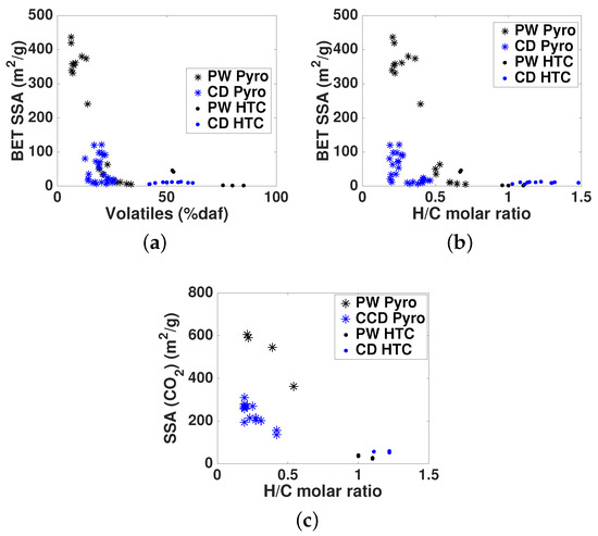 - Biochar specific surface area and pore volume increase with pyrolysis temperature [19,21,25] up to approximately 600–700 °C, when further ordering of the biochar structure may lead to a decrease in surface area [19,25]. Mainly micropores contribute to the specific surface area in biochars [21]. Other process parameters, such as biomass composition, specially inorganic species content, heating rate and pressure can have also a significant impact on porosity development [26,27]. Surface area and pore network may impact biochar adsorption capacity due to the influence on accessibility [18] and availability of adsorption sites.