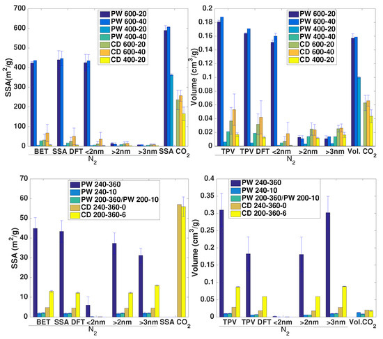 - The porous structure varies greatly among biochars. PW biochars produced at 600 °C present mainly microporosity with N-SSAs around 400 m g. In CD biochars this microporosity is lower (<100 m g). The significantly lower microporosity for all CD biochars is attributed to the high inorganic content, which could potentially block the micropores and enhance mesoporosity. PW and CD biochars produced at 400 °C present also micropores (as shown by CO adsorption), but much less developed than at higher temperatures, i.e., microporosity must be still developed through volatiles release, to open the pores, and further solid aromatization. Furthermore, a higher N sweeping flow during pyrolysis enhances microporosity (more than double for CD biochars at 600 °C). This indicates that micropores blocking is related to volatiles, which may further react to form secondary char or condense in the pores to a greater extent for lower flow rates, when the concentration and retention time of volatiles is higher. Hydrochars, on the contrary, present mainly mesoporosity, independently of the raw material and the process severity, having higher pore volume but generally lower SSA than biochars. Washing of hydrochars further increases the SSA and pore volume due to removal of condensed species.