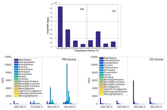 - PAHs are already produced in biochars at temperatures as low as 340 °C. The maximum quantity is detected for temperatures around 400 °C, exceeding in the case of PW the maximum level for certification. At higher temperatures the PAHs content is reduced again due to vaporization of these species from the solid matrix, achieving a premium quality for temperatures above 550 °C. The composition of these species is highly dependent on the feedstock: naphthalene is the main species in CD biochars, while phenanthrene and fluoranthene are the main species in PW biochars at low temperatures.