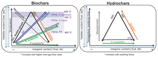 - Direct biochar contribution to nutrient availability relies on the macro- and/or micronutrients that biochar contains and their availability [5,9,10]. This is strongly dependent on the composition of the initial feedstock [10] and on the pyrolysis conditions. High retention of alkali species and P is reported for pyrolysis temperatures below 600–700 °C and low heating rates [12,13,14,15], with increase in total, soluble and exchangeable base cations with increasing process severity [13]. However, Uchimiya et al. [16] showed that NaOH-EDTA extractable P increased at 300–350 °C pyrolysis temperature and decreased at higher temperatures for plant and manure biochars. Hossain et al. [17] showed that total N content and N availability decreased with increasing pyrolysis temperature in wastewater sludge biochars.