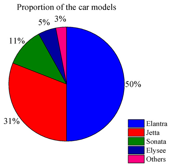 Currently, taxis in many cities are equipped with vehicle information collection devices such as GPS systems. There were approximately 65,000 taxis in Beijing in 2014, and the proportions of different car models of the current taxi are shown in Figure 1 [27]. The data used in this study come from GPS devices installed in taxis, which send information such as taxi identification, coordinates, time, driving speed, and passenger state to the taxi control center every 30 to 60 s. It covers approximately 30,000 to 40,000 vehicles, including more than 30,000 taxis, 5000 to 8000 sightseeing vehicles, and all car models of the current taxi in Beijing. These taxis account for approximately 50% of all taxis in Beijing and produce approximately 40 million records every day. We choose a typical workday and the weekend to comprehensively analyze temporal variations. An example of the dataset is shown in Table 2.