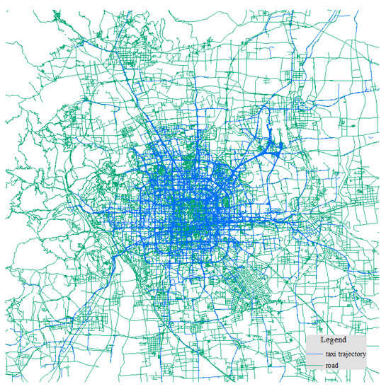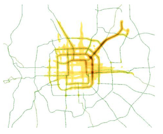 The data are stored in Oracle and, thus, are easily dealt with using the connection between Oracle (Oracle 11g, Oracle, Redwood City, CA, USA) and ArcGIS (ArcGIS 10.3, Esri, Redlands, CA, USA) software. For example, we clean records with invalid locations, those whose coordinates deviate significantly within a few seconds, and those whose speed is always at zero. We delete repetitive records and convert some fields to enable its direct use in the next step, thus reducing the data scale, as well as improving result accuracy and computing efficiency. We then match data points to spatial coordinates using the geographic map in ArcGIS, after which the “Track intervals to line” tool is applied to obtain taxi trajectories with an average speed, which are used later to obtain the fuel consumption, the distance, and driving duration between two adjacent points of the same taxi. Through the reconstructed taxi trajectories shown in Figure 2, we obtain the structure of the road network in Beijing (Figure 3), which corresponds closely to the actual road network.