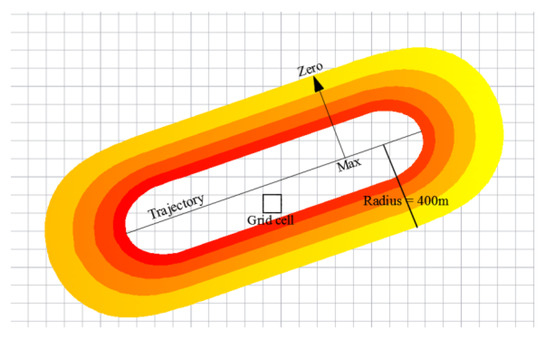 To clearly present the distribution of carbon emissions, set as an attribute of the reconstructed taxi trajectory segments in ArcGIS, we calculate the density of trajectory segments weighted by their carbon emission attribute, applying the kernel density tool. Kernel density can create a smooth curved surface over each line, whose value is greatest exactly on the line, and which decreases to zero as the distance increases to the search radius. The search radius is set as 400 m in this study to derive the standard density available for comparison between different results at different times. The volume under the surface is equal to the product of the line length and the weighted field, namely carbon emissions. Globally, each output raster cell is set as 100 × 100, and its density is the sum of all kernel surface values above it. Additionally, the length unit is meters, so the default area unit of the density is , which contains the impact of the carbon emission attribute. Finally, different density intervals are represented with specific colors to demonstrate the emission intensity. An illustration of the kernel surface over a line segment is shown in Figure 4, and a diagram of the kernel analysis result is displayed in Figure 5, in which the darker colors represent greater emissions.