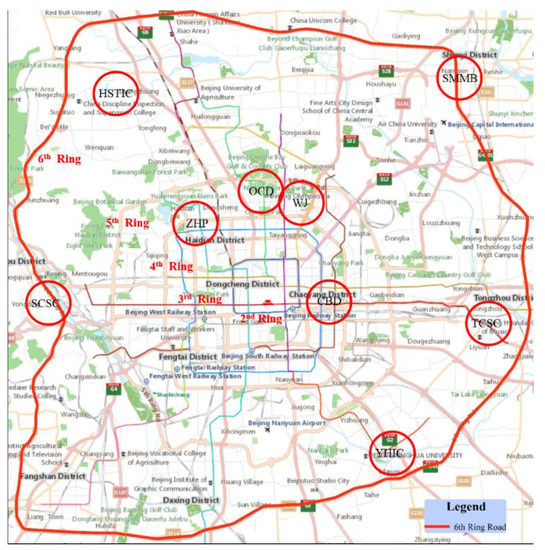 Beijing is a developed and vibrant mega city with a total city area and central city area in 2014 of 2831 and 939 km2, respectively. There are more than 23 million citizens living in Beijing, leading to substantial congestion, especially within the third ring road, where the population density reached 27,000 people per km2 in 2014 [35]. As the capital of China, Beijing is the political, economic, cultural, diplomatic, and high-tech innovation center, and residents have easy access to better infrastructure, health care, education, and more working opportunities. Beijing has a hollow, ring-shaped multi center structure, known as a “two-axis, two-belt, and multiple centers” structure; the research area of this study lies mainly within the sixth ring road (Figure 6). The multiple centers refer to the core function regions of the city, including the Zhongguancun High-tech Park (ZHP), Olympic Center District (OCD), Central Business District (CBD), Haidian Science and Technology Innovation Center (HSTIC), Shunyi Modern Manufacturing Base (SMMB), Tongzhou Comprehensive Service Center (TCSC), Yizhuang High-tech Industry Center (YHIC), Shijingshan Comprehensive Service Center (SCSC), and Wang Jing (WJ), called “the first community of the capital” (Figure 6).