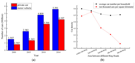Due to increasingly rapid economic and technological development in China, traffic demands have surged rapidly. For example, the motor vehicle and private car population had approached 5.6 and 4.2 million, respectively, by 2014 in Beijing (Figure 7a), and the number of cars per household and per square kilometer are illustrated in [35]. The number of cars has continued to grow, and car density decreases with distance from the center of Beijing (Figure 7b) except for the area in 2nd to 3rd Ring Roads, where car density increases to 55,000/km2 [35]. As a consequence, traffic congestion and air pollution become increasingly severe, and the number of motor vehicles and amount of exhaust emissions must be regulated to relieve traffic jams and improve air quality in Beijing. Therefore, determining the carbon emission patterns of taxis is critical for authorities to make more reasonable management policies, and for taxi companies to promote their operation and management, save operating costs, and most importantly, provide more favorable services for passengers.