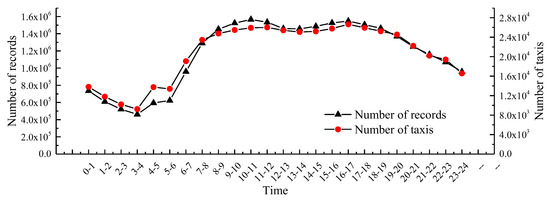 The number of taxis and records are related throughout the day, with a minimum at 03:00–04:00 when most people are sleeping. The gap between car number and car usage is greatest from 04:00–06:00. Interviews with taxi drivers reveal that most taxi drivers take a shift in this time interval; therefore, not all of them are on full duty. After 06:00, the number of cars on duty climbs to 25,000 cars at 10:00, signifying that many drivers start work during this time interval. Numbers remain stable until 18:00 and then decrease steadily to the minimum. Several specific and typical time intervals are chosen to analyze the spatiotemporal carbon emission patterns in Section 4.3.