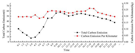 The CEPK, which is a global and standard indicator, can evaluate carbon emission levels more objectively, without considering the influence of the individual characteristics and driving conditions of taxis. The total carbon emissions per hour varies substantially during the day (Figure 9), while the CEPK exhibits a slight fluctuation.