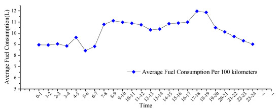 FCPOK varies substantially from 8.43 L from 05:00–06:00 to 11.97 L from 17:00–18:00 (Figure 10). After 18:00, the average FCPOK slowly decreases with the gradual increase of average travel speed, as shown in Figure 11, which denotes that the travel speed and FCPOK are negatively correlated in a certain range of speed. The average fuel consumption for the entire day is 10.02 L. To verify the analytical result of FCPOK, we sampled 120 taxi drivers randomly, considering the different car models proportions shown in Table 4. Each vehicle corresponds to an FCPOK. The weighted average FCPOK derived from all questionnaires is 8.23 L. The analytical result (10.02 L) is 21.7% more than the figure we investigated (8.23 L).