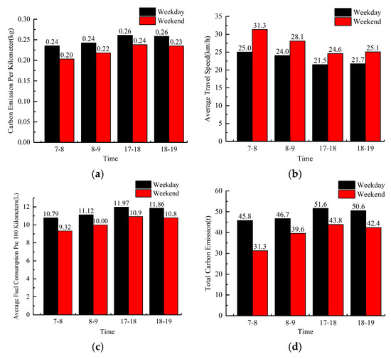 Thus, we analyze the spatiotemporal carbon emissions and taxi travel patterns in Beijing and compare their differences between weekdays and weekends. At a temporal level, we analyze the laws of carbon emissions, fuel consumption, average travel speed, and total travel distance at different time intervals. From the spatial perspective, we analyze the dynamic distribution of carbon emissions at different time intervals. All the differences in these indicators are compared between weekdays and weekends, in the morning and evening rush hour periods.
