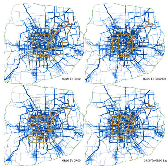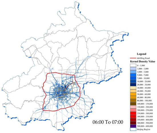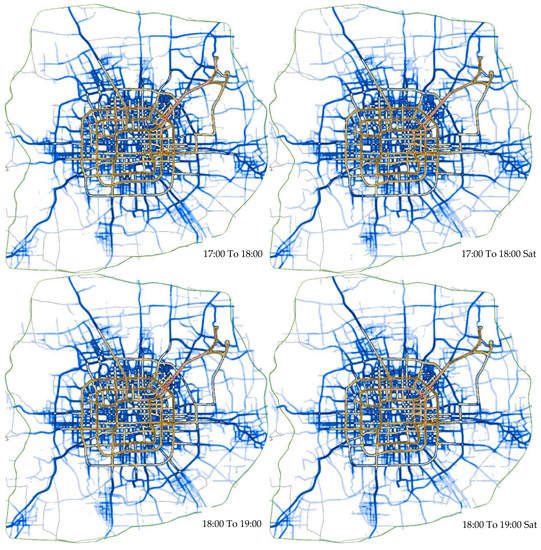 After analyzing the temporal carbon emission patterns, we focus on spatial emission distribution characteristics and their dynamic variations with time. Travel activities are mainly distributed within the 6th Ring Road, namely the city center (Figure 13). In fact, carbon emission patterns are highly consistent with the city structure. Therefore, we mainly focus on the area within the 6th Ring Road.