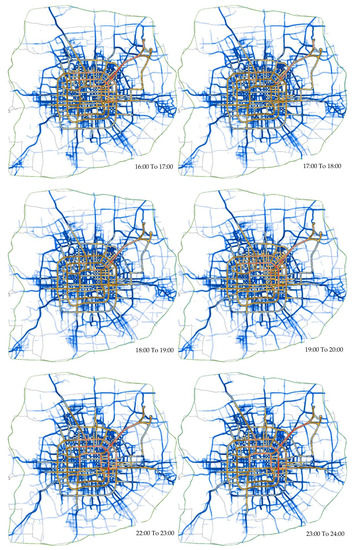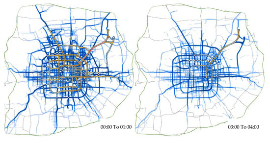 From the perspective of time, although the global distribution patterns of carbon emissions do not change substantially, detailed local distributions show distinct variations with time. At the beginning of the day, there is a relatively wide distribution of carbon emissions related to the vibrant night life of a capital city. Then, carbon emissions gradually decrease (indicated by a lighter color in Figure 14) in all regions from 03:00–04:00. From 06:00, they increase at the Airport Expressway and gradually extend to the Ring Roads and particularly to intersections. Notably, carbon emissions increase from the northeast to the southwest with time in the day and decrease in the opposite direction, which confirms that economic development is higher in the northeast than southwest. From approximately 08:00–09:00, high carbon emissions spread to the expressway, the arterial road, the second trunk road, and even the city streets, until they eventually covering the entire city area, indicating increasingly serious traffic jams during the morning rush hour period. The hot spots at 12:00–13:00, coinciding with relatively low travel distances shown in Figure 11, show lower emissions. Then, the distribution decreases until the evening rush hour period at approximately 19:00, when the color becomes darker than before because people return from work. Following the evening rush hour period, there are no significant changes until midnight, when the cycle starts again. The detailed changes throughout one day can be clearly seen in the supplementary video.