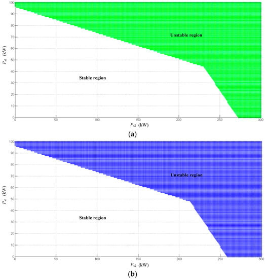 As shown in Figure 4c, the operation point (Ps1 = 50 kW, Ps2 = 50 kW) is in the stable region; the operation point (Ps1 = 80 kW, Ps2 = 50 kW) is also in the stable region, but close to unstable region; and the operation point (Ps1 = 90 kW, Ps2 = 50 kW) is already in the unstable region.