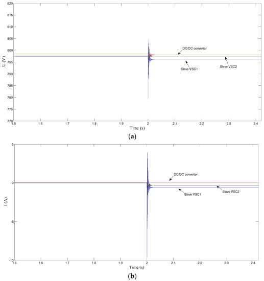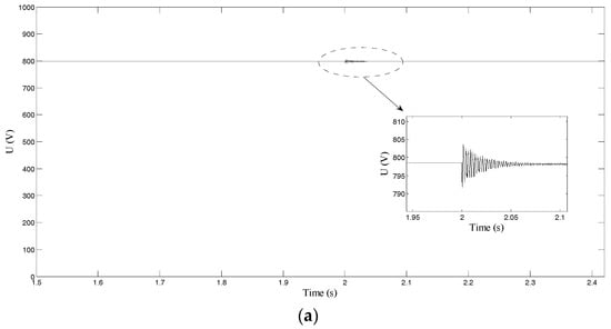 Figure 5 describes the simulation waveform of Udc when the operation point (Ps1 = 50 kW, Ps2 = 50 kW) is changed to (Ps1 = 80 kW, Ps2 = 50 kW) and (Ps1 = 90 kW, Ps2 = 50 kW) at t = 2 s. As shown in Figure 5a, Udc has a short-term and small amplitude oscillations when Ps1 changes, but it can quickly restore a steady state. As shown in Figure 5b, when Ps1 is changed to 90 kW, Udc cannot be restored to a stable voltage after the short-time damping oscillation, and there is then a divergent oscillation until instability of the voltage.