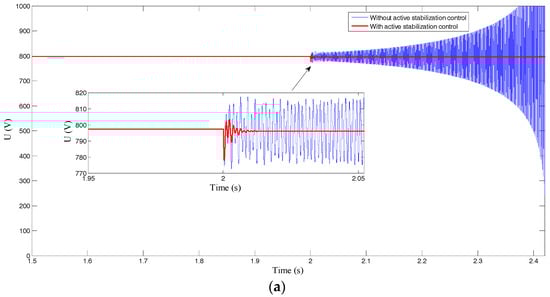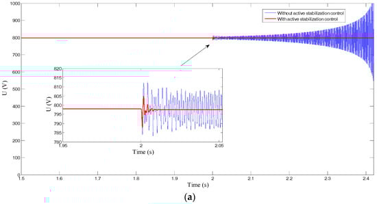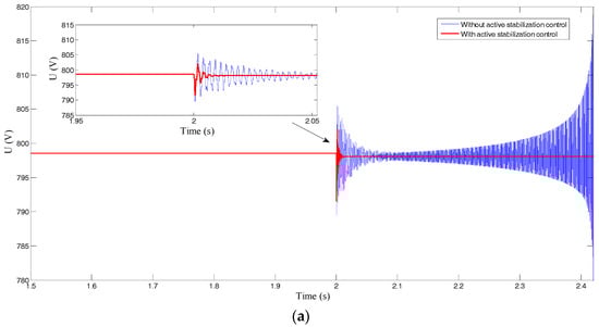 As shown in Figure 8a, Figure 9a and Figure 10a, Udc, Us1, and Us2 cannot be restored to a stable voltage until instability without active stabilization control when Ps1 is increased to 90 kW. It is worth noting that after implementation of active stabilization control, Udc, Us1, and Us2 can be stabilized quickly, within 40 ms, after a small amplitude oscillation.
