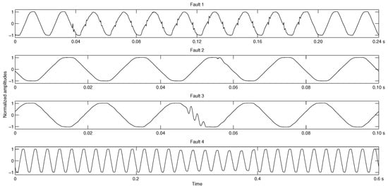 The four types of faulty signals under test. Fault #1: Harmonics. Fault #2: Impulsive transient (Dirac delta). Fault #3: Oscillatory transient (700 Hz). Fault #4: A voltage sag characterized by a duration of 0.15 s.