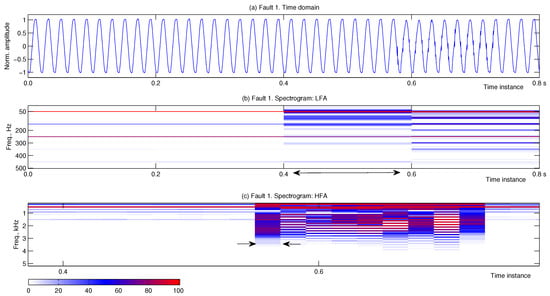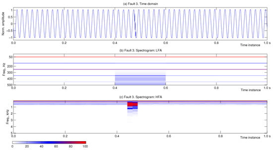 Fault #3 is depicted in Figure 5 and consists of a 700 Hz oscillatory transient with a duration of 8 ms. Focusing on LFA analysis, the event is short regarding the analyzed 10-cycle segment, but it produces a soft footprint for frequencies higher than 250 Hz. In the HFA, the footprint is clearer and more accurately demarcated, revealing that the most relevant frequencies are centered around 700 Hz.