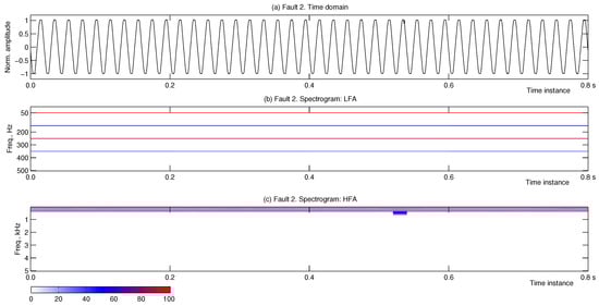 Fault #2, whose analysis is shown in Figure 4, produces a minor deviation in the 50 Hz line, shown within the LFA; only the commented underlying harmonics are marked during the analyzed period. On the contrary, the event is targeted in the HFA for frequencies lower than 1 kHz.