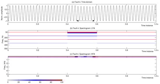 Figure 3 shows Fault #1, which illustrates that both significant deformation and long duration of the transients produce important deviations in the HFA and the LFA. The fault takes place within two 10-cycle segments of the LFM computation (between 0.4 and 0.8 s). The LFA shows the beginning of the event and the HFA reveals the harmonic/periodic structure in the 50–400 Hz (2nd, 4th, …, harmonics). The 50 Hz resolution in the HFM cannot be used to determine the harmonic/periodic structure already commented (the result is a continuous red zone in low frequencies since harmonics are 50 Hz equally spaced, which is exactly the resolution of HFM). Additionally, inter-harmonics are targeted in the analysis, as indicated by IEEE 519-2014 [28] and IEEE 1159-2009 [25]. On the other hand, this analysis demarcates the limits of the event with a resolution of 1 cycle (between 0.56 s and 0.74 s) and reveals that the frequencies far from the fundamental component have a significant presence during the event. Concretely, the frequencies around 900 Hz are associated with a kurtosis value of 100, revealing the periodic structure.