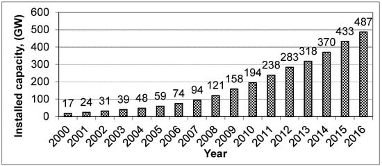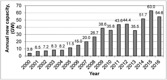 The global wind power capacities have been on the rise for almost last two decades. The continuously encouraging international trends are clear indicative of an increasing role of renewable energy sources in general, and wind power in particular meeting the current and future electricity demands [1]. The cumulative wind power installed capacity was 17 GW in 2000 and reached to 194 GW in 2010 GWEC [2], an average annual growth of around 104% over a 10-year period, as shown in Figure 1. From 2010 onwards, on an average, the global wind power installed capacity growth was 24.64%. The cumulative capacity was 238 GW in 2011 while reaching 283 GW in 2012, corresponding to an increase of 18.90%. In 2016 the global wind power installed capacity rose by 12.5% compared to 2015. The annual wind power addition on global scale is provided in Figure 2. China with 23.328 GW wind power capacity addition in 2016 remained on top of the world while USA with 8.203 GW capacity additions stood at second place. Next Germany, India, and Brazil took third, fourth, and fifth place in terms of annual wind power capacity additions of 5.443, 3.612, and 2.014 GW in 2016; respectively. It is worth mentioning that India took the fourth place whereas new wind power capacity addition is concerned in the year 2016.