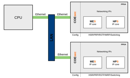 Figure 2 shows how networking IPs implemented in a FPGA can be securely configured by a CPU located in the same network. In this scenario, the CPU is responsible for both generating and receiving COEsec messages to configure the desired networking IPs. Furthermore, it behaves as a server that allows remote configuration in WAN using higher level protocols such as HTTPS.