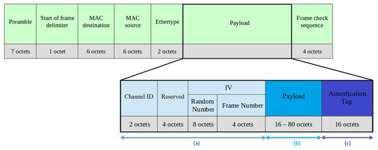 - Authentication Tag: in order to prevent an attacker from modifying the messages, an authentication tag is used (16 bytes long). This tag has been generated using a Hash function which assures that if any of the bits of the authenticated fields changes, the tag will take a different value. The authenticated fields are: Channel ID, Reserved, IV and Payload, as well as, the Ethernet header (MAC destination, MAC source and Ethertype).