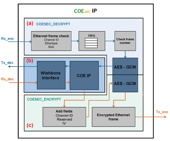 Block diagram of the COEsec architecture implementation. (a) Module for reception, validation, and decryption of COEsec frames. (b) Module to establish communication between the COEsec and the IP core, all through bus Wishbone. (c) Module to generate, encrypt and transmit COEsec frames.