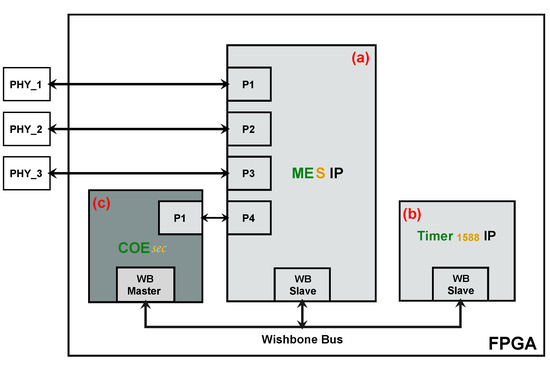 The architecture shown in Figure 5 comprises a 4-port IEEE1588-aware Managed Ethernet Switch (MES) IP [25], an IEEE1588 Timer and Timestamping IP, a COEsec IP instance, and a simple Wishbone [26] system interconnection architecture. The IP switching and timing infrastructure implemented in the FPGA can be configured by means of any Ethernet ports, since all COE frames are addressed to the COEsec IP that processes them and configures the IP through the Wishbone Master interface. The proposed design is simulated by means of Vivado Simulator to verify its proper performance. A screen capture of the simulation in the COEsec module is shown in Figure 6.
