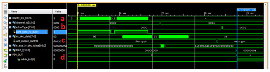 Moreover, the simulations are used to determine the processing time of a COEsec frame from it entering the core until the data is saved in the IP core register to be configured. In addition, simulations for writing and reading frames using different transmission rates (e.g., 10 Mbps, 100 Mbps, 1 Gbps) are performed, the results of which are summarized in Table 3.
