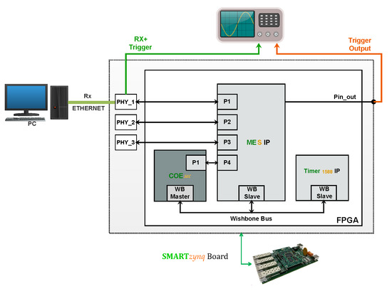 The proposed architecture described in the previous section is validated in a proof of concept using the configuration depicted in Figure 7. It is composed by a PC, an FPGA based card (SMARTzynq Industrial Networking card [27]) and a multiport oscilloscope. In this scenario, a PC is responsible for sending and receiving the COEsec frames, which are generated by means of Python scripts.
