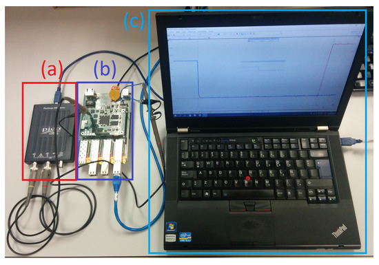 Snap-shoot of SmartZynq COEsec concept-proof set-up. (a) Multiport oscilloscope. (b) SMARTzynq Industrial Networking card. (c) PC for sending and receiving the COEsec frames.