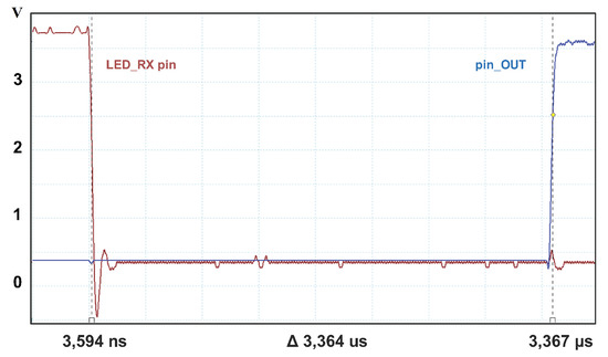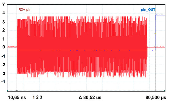 Furthermore, for measurements at rates of 100 Mbps and 1 Gbps, the first channel is connected to the LED RX pin of the PHY, which reports when a frame is received. Figure 10 shows the capture for a 1 Gbps rate obtaining a processing time of s, which is similar to the s obtained by simulation. Note that for obtaining the total processing time, it is necessary to consider the latency introduced by the PHY.