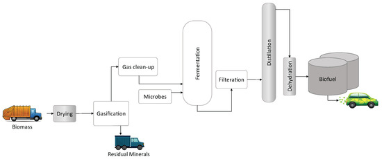 This section presents a classification of furanic fuels based on chemical structure. Moreover, it reviews the various production methods from biomass feedstock. A representative bio processing plant is shown in Figure 1. The process starts with the drying of biomass to prepare it to subsequent gasification, in which the carbon-based biomass is oxidized at high temperatures of 1073–1473 K. The gasification process produces a combustible mixture of CO2 and hydrogen. This mixture is cleaned up and fermented. Then, it can be converted into biofuels, including furans, through distillation and dehydration. Furanic biofuels can be categorized under two main groups in this text. The first is furan and substituted furans, while the second is tetrahydrofuran and alkyl tetrahydrofurans. These two groups call for different production processes.