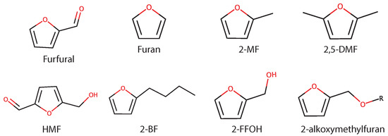Furan and substituted furans are mostly obtained from the platform chemicals called furfural and 5-hydroxymethyl-2-furaldehyde (HMF) (see Figure 2). The processes involve bond-breaking and bond-formation through hydrogenation and dehydration reactions. The synthesis also involves important reactions such as deoxydehydrogenation, hydrogenolysis, decarboxylation and decarbonylation [31]. The chemical structures of furan and some substituted furans are shown in Figure 2. The focus of this subsection will be on the most promising substituted furanic biofuels, namely 2-methylfuran (2-MF) and 2,5-dimethylfuran (2,5-DMF) [32,33]. Table 1 shows some of the thermophysical properties of 2-MF and 2,5-DMF.
