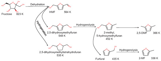 With regards to the decomposition of furans, one of the earliest efforts in this direction was the study by Grela et al. [134], who performed a kinetic investigation of the thermal decompositions of furan, 2-MF and 2,5-DMF under very low pressure conditions of about 1 mTorr in a heatable molecular flow reactor. The results indicated that furan, 2-MF and 2,5-DMF undergo unimolecular decomposition at a temperature range of 1050–1270 K through ring opening reactions. Loss of CO is the only process for furan and 2-MF decomposition, while it is a major one in 2,5-DMF decomposition, among other processes.
