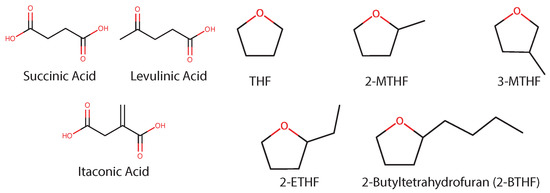 The second group of furans to be discussed in this section is tetrahydrofuran and alkyl tetrahydrofurans. This group of furanic compounds is mostly obtained from the platform chemicals succinic acid, levulinic acid and itaconic acid [31] (see Figure 4). The chemical structures of tetrahydrofuran and some alkyl tetrahydrofurans are presented in Figure 4. The focus of this subsection will be on tetrahydrofuran (THF) and 2-MTHF, which have received greater attention for combustion system applications. The thermophysical properties of these biofuels are shown in Table 1.