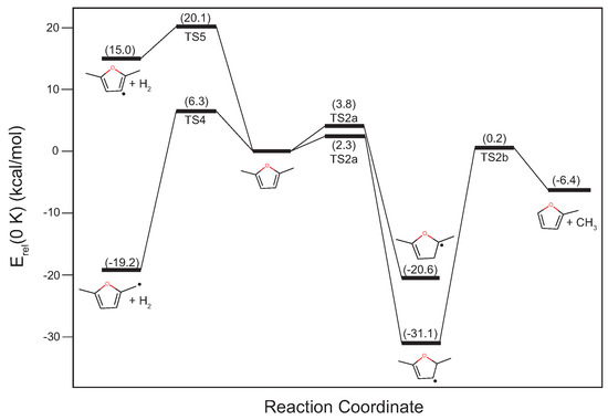 Moreover, the reactions of 2,5-DMF with radicals were investigated in a number of studies [121,122,123]. Potential energy surface for the reaction H + 2,5-DMF → products was calculated by Friese et al. [121], as shown in Figure 5. The results indicated that the main mechanism, with yields over 75%, for the previous reaction is an addition-elimination mechanism to produce 2-MF + CH3. The same reaction was investigated by Sirjean and Fournet [122], showing that the important pathways in the addition process are the substitution reaction 2,5-DMF + H→ 2-MF + CH3 and the production of 1,3-butadiene and acetyl radical (CH3CO). The study revealed that the calculated branching ratios are slightly pressure-dependent. Furthermore, Ferraz-Santos and Bauerfeldt [123] used the DFT approach to investigate the potential energy surface for the 2,5-DMF + OH reaction. The results revealed that the formation of a pre-reaction complex in the addition pathways is effective only for temperatures below 550 K. Therefore, the authors inferred that OH addition paths are active under low temperatures, while H-abstraction channels become more dominant under typical combustion conditions.