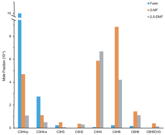 Comparison of measured mole fractions of pyrolysis products 2-MF, 2,5-DMF and furan at 75% fuel conversion (adapted from Cheng et al. [139]).
