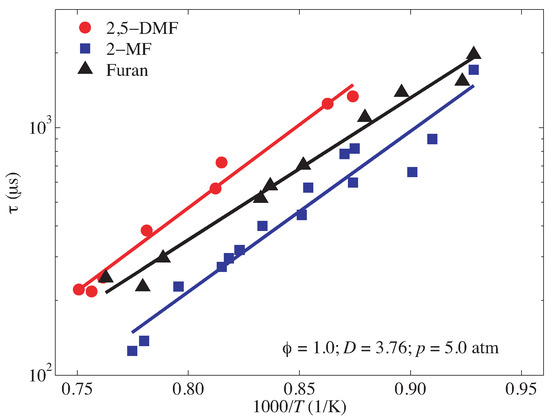 - Xu, N.; Tang, C.; Meng, X.; Fan, X.; Tian, Z.; Huang, Z. Experimental and kinetic study on the ignition delay times of 2,5-dimethylfuran and the comparison to 2-methylfuran and furan. Energy Fuels 2015, 29, 5372–5381. [Google Scholar] [CrossRef]