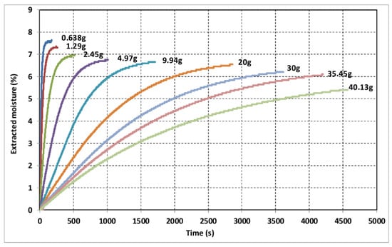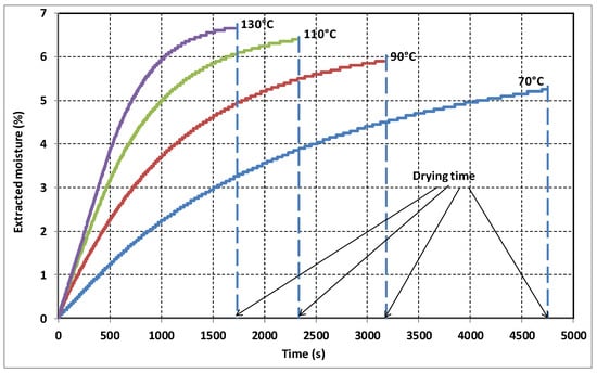 Table 2 shows time constant τ and moisture H0, calculated from the drying curves shown in Figure 1. The extraction rate (% per min) is determined by the derivative of Equation (10). The estimated moisture is calculated when the extraction rate is equal to 0.02% per min (the threshold for which the drying apparatus has been set to stop drying and display the result of moisture).
