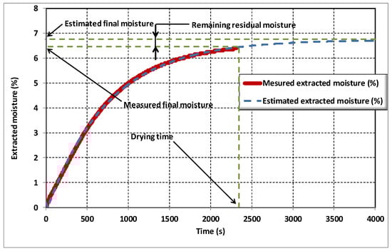 The approximation of the drying curves by Equation (10) is performed by optimizing the quadratic error between the measured drying curves and the curves calculated by Equation (9). The results of this optimization will allow calculation of the final moisture H0 and time constant τ. The drying phenomenon can be modeled as a transient evolution, as the time constant of Equation (10) characterizes the time at the end of which equilibrium is reached—this is to say, when the extraction rate reaches a threshold of 0.02% per min. This optimization is achieved by using the MATLAB (R2013b) function algorithm “fminsearch”, which allows one to find the minimum of an unconstrained multivariable function using a derivative-free method. The multi-variables to be determined are the time constant and the final moisture percentage, and the function is Equation (9). The extraction rate (% per min) is determined by the derivative of Equation (10). The estimated moisture is calculated when the extraction rate is equal to 0.02% per min (the threshold for which the drying apparatus has been set to stop drying and display the result of moisture).