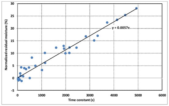 In addition, from the results of this analysis, it can be seen that the residual moisture in the paper after the drying process is higher if the drying time constant is large, as shown in Figure 4, where residual moisture is normalized to the initial moisture. It may be noted that in this case, at the end of a drying process, more than 25% of the initial moisture can remain, if the drying is done with a close time constant of 5000 s.