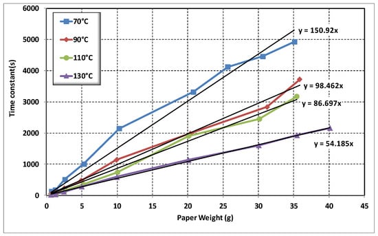 The analysis of the curves shows that time constant τ is directly proportional to the weight of the paper to be dried, as well as the drying temperature. The evolution of time constant τ can be estimated by linear curves. Therefore, the equation that relates the drying time constant τ and the paper weight M can be written as follows: