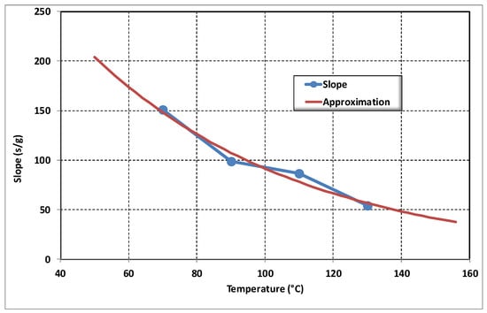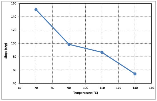 where P is the slope of the linear approximation curves of the time constant, depending on the weight of the paper (M). The P slope depends on the drying temperature, and its evolution is presented in Figure 6.