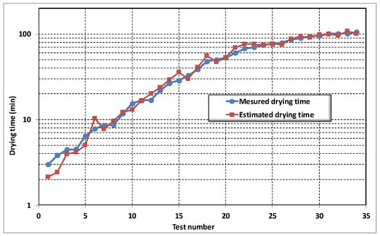 The drying times calculated by the model, based on the paper weight, drying temperature, and drying time determined by the drying apparatus, are shown in Table 3 and Figure 8: